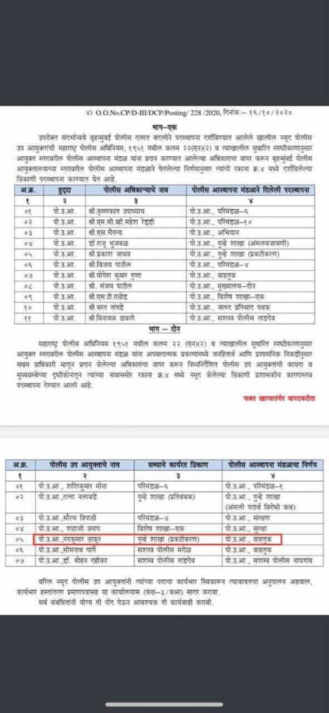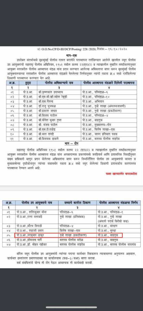 It was per this order by the Home Minister (headed by NCP) that Nandkumar Thakur was moved to the crime branch in July, while the crime branch DCP Shahaji Umap has been transferred to special branch-1.