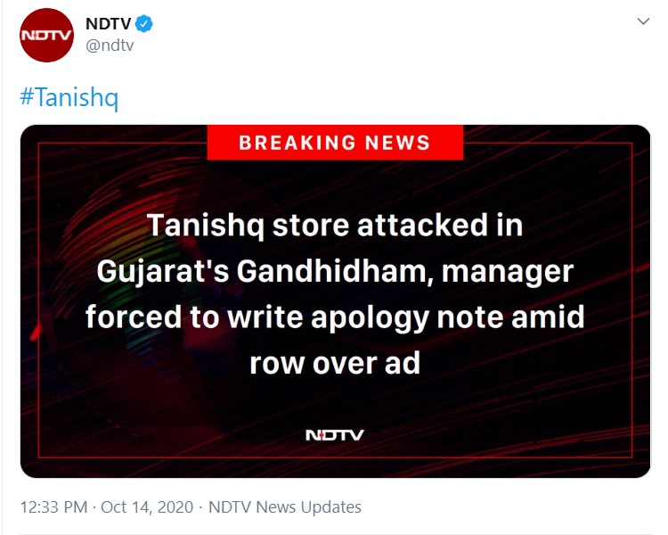 Earlier, the left-wing channel NDTV had peddled fake news claiming that a mob had attacked the Tanishq store in the city and had forced the manager of the showroom to apologise for the advertisement that their company had put out on Tuesday.