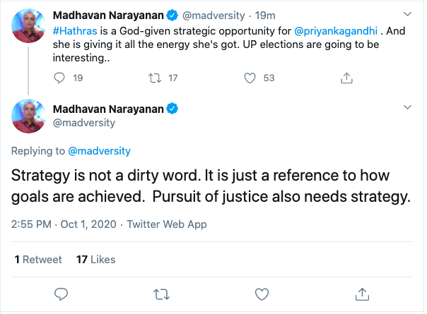 The journalist Tweeted: “#Hathras is a God-given strategic opportunity for @priyankagandhi. And she is giving it all the energy she’s got. UP elections are going to be interesting…