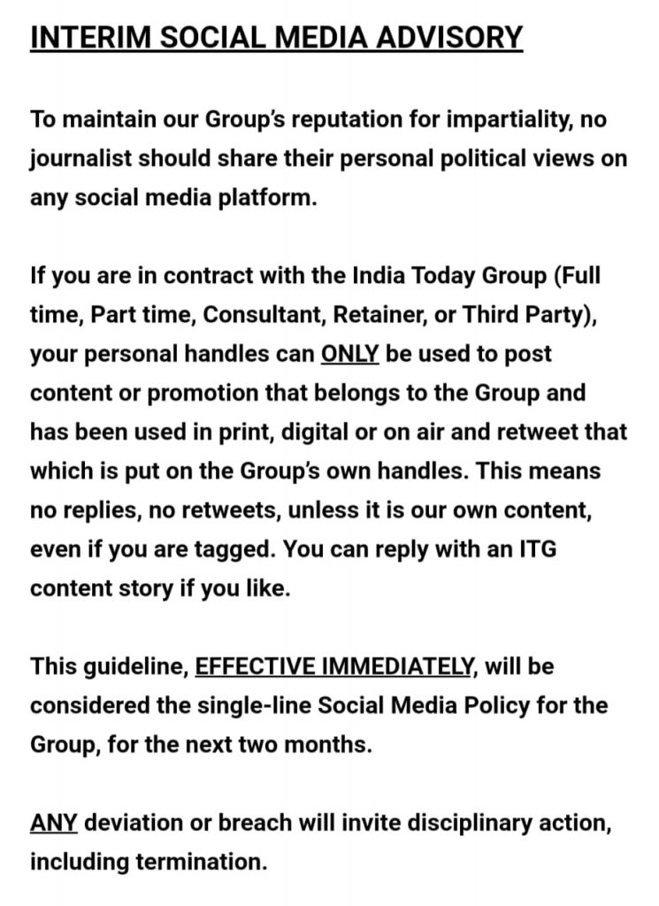 The advisory says that those having any contracts with the India Today Group can use their personal handles only for posting the content or promotion belonging to the Group that has been used in print, digital or on air. It further says that such persons cannot even reply or retweet to any post even if they have been tagged in it. They can respond to the post only with the content of the ITG.