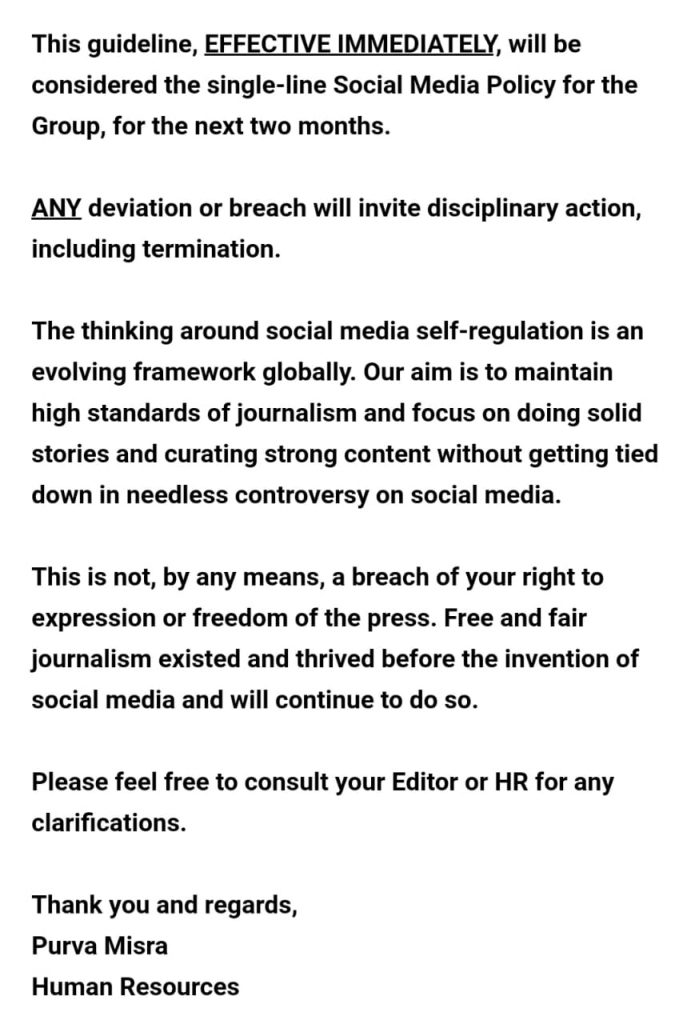 The advisory says that a breach of the guidelines will invite disciplinary action, including termination. Though the guidelines apparently impose a complete prohibition on posting any personal comment on social media from personal accounts of any person having any contract with the India Today Group, ironically the advisory claims that this is not a breach of the freedom of expression and the press. The advisory says that the guidelines have been issued to “maintain high standards of journalism” and to “focus on doing solid stories and curating strong content” while avoiding any needles controversy on social media.
