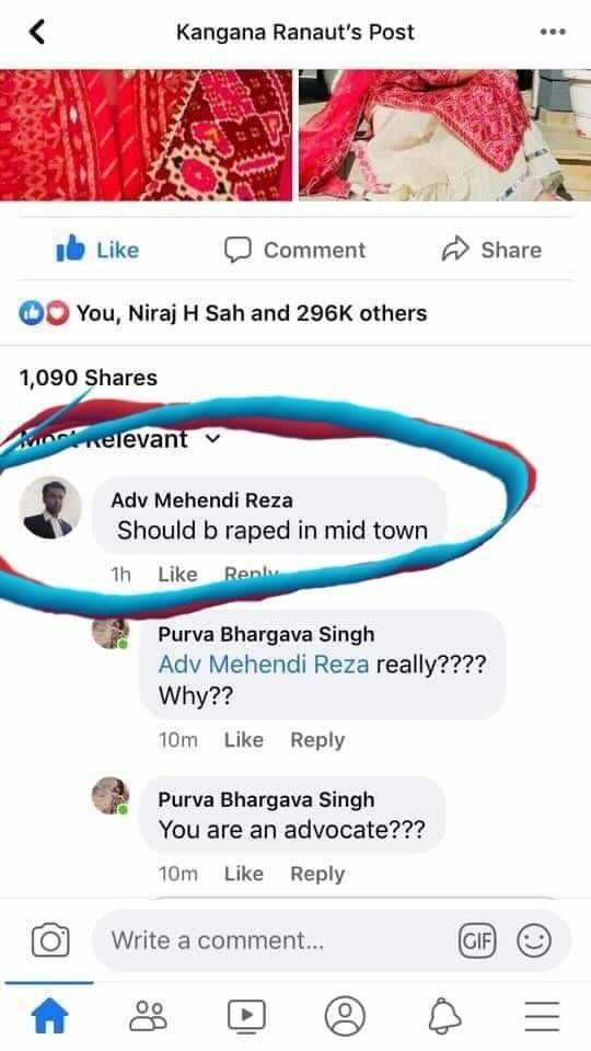 Mehendi Reza, a lawyer from Odisha, gave rape threats to actor Kangana Ranaut in the comments of a post on her official Facebook page. When people confronted him, he alleged that his ID was hacked in an apology post on his profile.