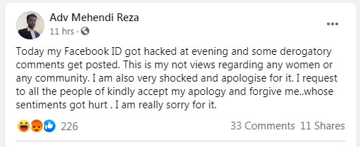 When several users confronted him for his comment, he alleged that his Facebook ID was hacked, and someone else posted the comment. He wrote, “Today my Facebook ID got hacked at evening and some derogatory comments get posted. This is my not views regarding any women or any community. I am also very shocked and apologise for it. I request to all the people of kindly accept my apology and forgive me whose sentiments got hurt. I am really sorry for it.”