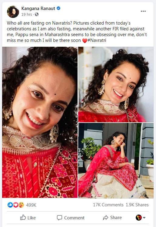 On 17th October, actor Kangana Ranaut posted a few photographs and wished everyone on Navratri. She also informed me that another FIR had been registered against her. She wrote, “Who all are fasting on Navratris? Pictures clicked from today’s celebrations as I am also fasting, meanwhile another FIR filed against me, Pappu sena in Maharashtra seems to be obsessing over me, don’t miss me so much I will be there soon.”