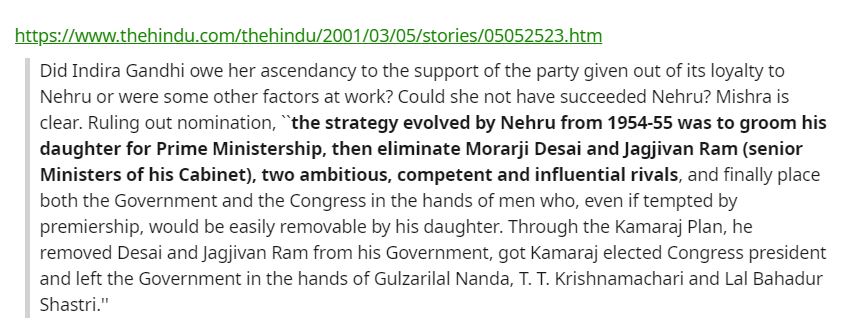 In fact, DP Mishra, a senior Congress leader who closely witnessed power transitions after Nehru’s and Shastri’s deaths explains Nehru’s game plan. The strategy evolved by Nehru was to groom his daughter for PM-ship, then eliminate Morarji Desai and Jagjivan Ram, two ambitious, competent and influential rivals, and finally place both the Govt and the Congress in the hands of men who, even if tempted by premiership, would be easily removable by his daughter. Through the Kamraj plan, he (Nehru) removed Desai and Jagjivan Ram from his government, got Kamaraj elected as Congress President and left the government in the hands of Gulzarilal Nanda, TT Krishnamachari and Lal Bahadur Shastri.”