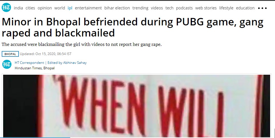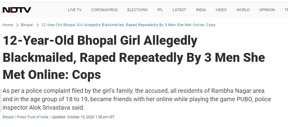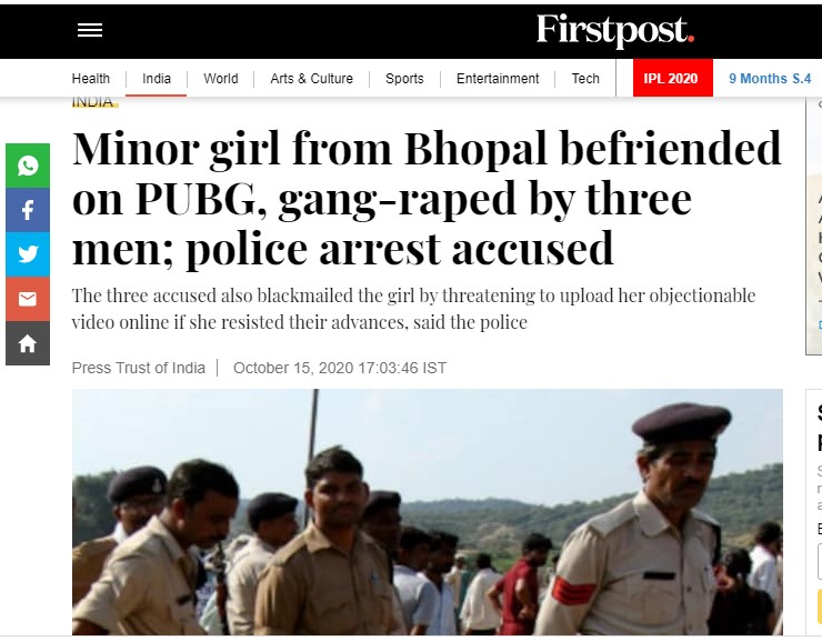 In a shocking incident that took place in Bhopal, Madhya Pradesh, a minor girl was raped by three boys whom she has reportedly met through online game PUBG which has now been banned by the government. The incident came to light on October 14 when the girl finally told her mother about the incident. Her mother went to the Ashoka Garden police station to file a complaint against the accused. The police have nabbed all the three accused using their mobile phone locations. The accused Fuzail, Farhan and Rizwan have confessed to the crime on being interrogated by the police. But these names were missing from a report on the incident by PTI, thereby hiding the identity of the accused.