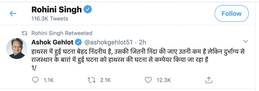 Rajasthan Chief Minister tweets how it is unfair to compare the two incidents because the same two minor girls said in front of magistrate that they had gone with the two boys on their own will. Singh retweets it.