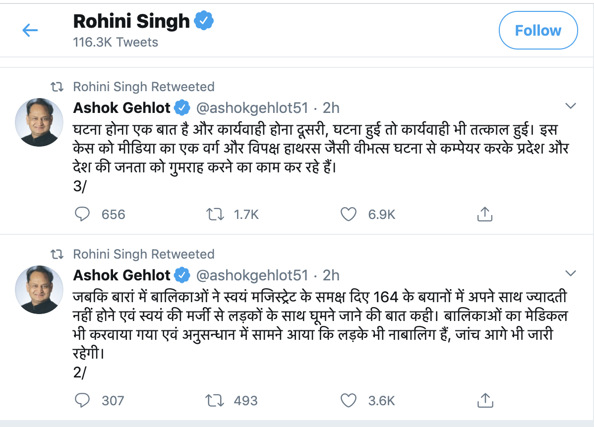 Gehlot is essentially saying that since two minor girls said in front of a magistrate that they went on their own, what they said in front of a camera previously would be false, right? And whatever happened to the fact that sex with minor, even if consensual, is rape. Rohini Singh retweeted these tweets only to undo the retweets later. She perhaps realised how Gehlot’s little tweet theory is flawed.