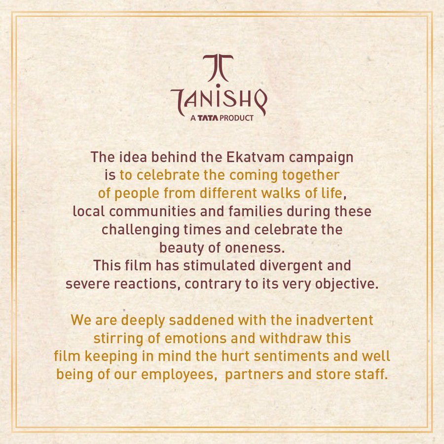 Tanishq said in its statement, “We are deeply saddened with the inadvertent stirring of emotions and withdraw this film keeping in mind the hurt sentiments and well being of our employees, partners and store staff.” It also said, “This film has stimulated divergent and severe reactions, contrary to its very objective.”