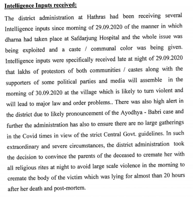 Secondly, there was already a high alert in the district due to the verdict of the Ayodhya- Babri case. And also the government had to ensure that there were no large gatherings in the Covid times in view of the central govt guidelines. It told the apex court that in such extraordinary and severe circumstances the district administration decided to convince the family of the deceased to cremate her with all religious rites at night to avoid large scale violence in the morning.