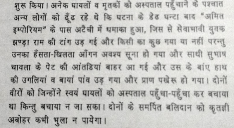 There were many organizations in Abohar at that time. Some were affiliated with political parties as well. However, according to records, only BJP leaders and RSS workers rushed out of their homes to help the injured. The rest of the leaders decided to stay safe and never came out of their homes. When my Nanaji first told me about the incident, he mentioned that some people went to their leaders’ homes, but no one came out to help.