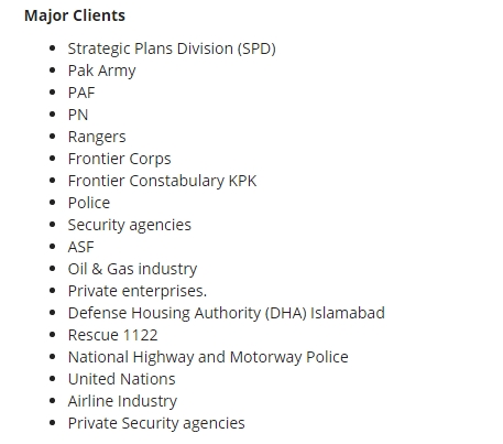 In fact, the about us page on the website of MEI makes it clear, as it mentions that the company is serving the military/government sector by providing radio systems. The company’s major clients include virtually every arm of police and defence establishment in Pakistan. It lists Strategic Plans Division, Pakistan Army, Pakistan Air Force, Pakistan Navy, Pakistan Rangers, Frontier Corps, Frontier Constabulary KPK, Police, Airports Security Force, Security agencies etc as its major clients, apart from other government and private organisations.