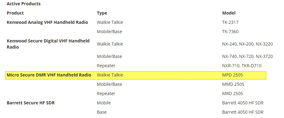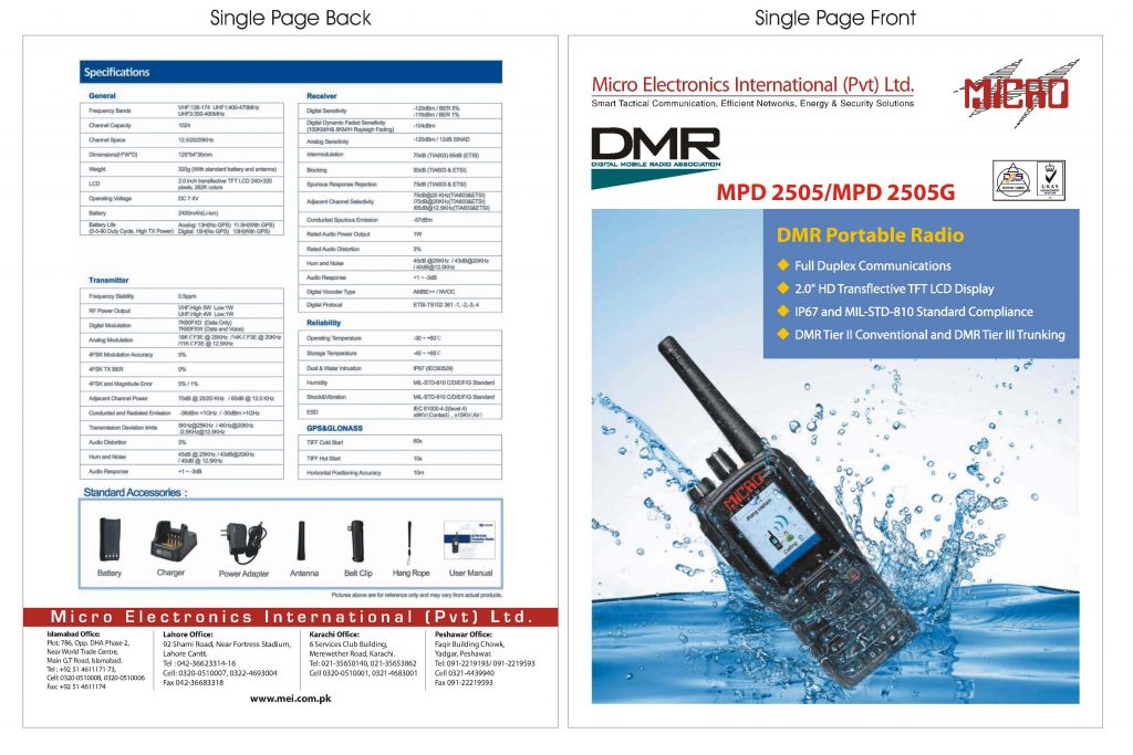 The website of the company informs that MPD 2505 is a Walkie Talkie type Micro Secure DMR VHF Handheld Radio. The website also features the product brochure of the DMR made by the company, which mentions its technical and other specifications. The specifications made it clear that it is a military-grade product.