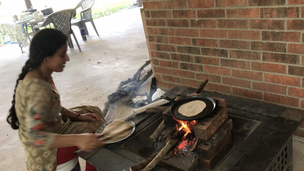 Abhinav set up a chulha (clay stove) behind the house where one could make roti (round flatbread) in Indian village style. Dry twigs, branches and even cow dung cakes were used as fuel. Friends and volunteers often dropped in during the weekends to have delicious Indian meals accompanied by the traditional rotis. It was a dream-come-true for Indians irrespective of which state of India they hailed from. When my husband and I were treated to the fresh, inflated rotis emerging from the chulha, and ate while gazing at the cows in the distance, we were transported to timeless India. I watched with astonishment when Abhinav walked away to give the first roti that came off the chulha to the cows. This was exactly what was prescribed in Hindu Shastras! Among the five Mahayajnas that householders have to perform is the Bhuta Yajna which involves the offering of food to animals, birds, insects and beings of the invisible world.