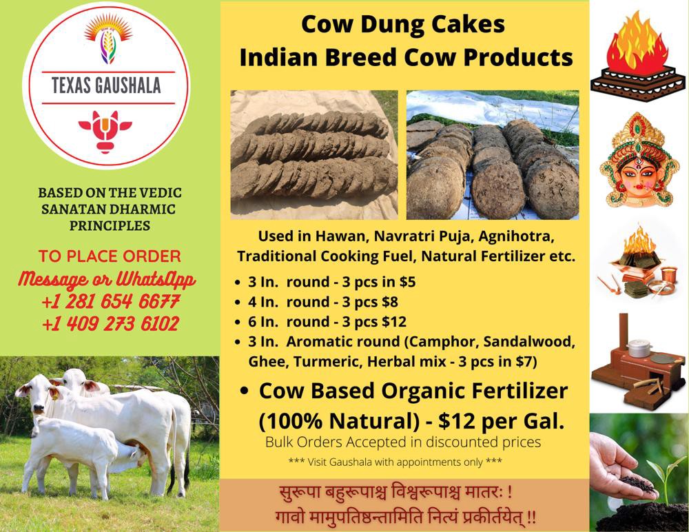 Once the flyers announcing the sale of cow dung cakes were circulated, many Hindus began placing orders to buy them from mid-October. Gomaya (cow dung) is considered very auspicious to use in yajna or fire ceremonies. During the Navaratri festival, many individuals and temples perform yajna. The Gomaya from Texas Gaushala was donated by many Hindus to temples.