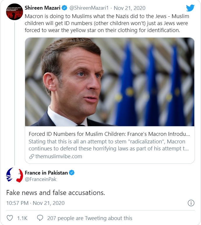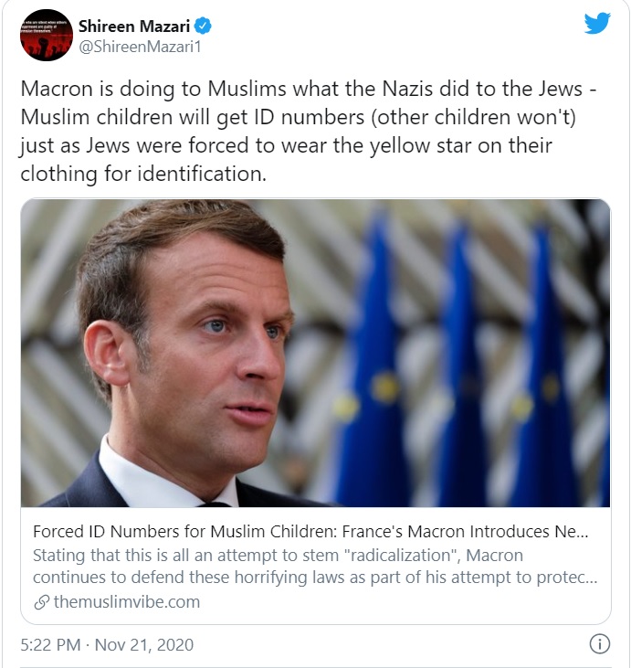 Sharing a news report published by a website called the Muslim Vibe, Shireen Mazari said that French President Macron was doing to Muslims what Nazis did to the Jews in the country. She claimed that Muslim children in France will be assigned special identity numbers just as Jews in Nazi Germany, who were forced to wear the yellow star of David on their clothing for identification.