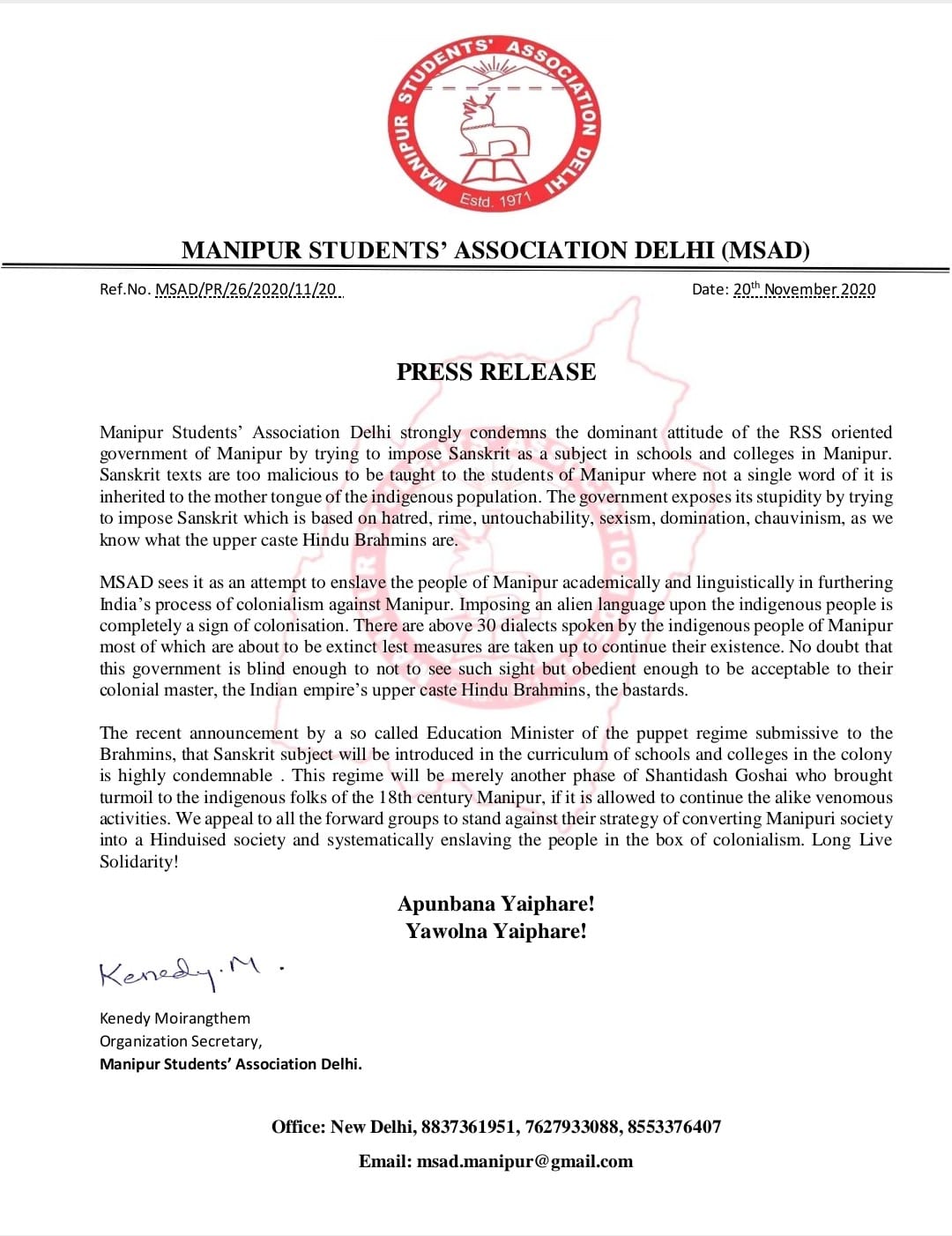 The student group further accused the BJP government of converting Manipuri society into a ‘Hinduised society.’ It stated, “This regime will be merely another phase of Shantidash Goshai who brought turmoil to the indigenous folks of the 18th century Manipur if it is allowed to continue the alike venomous activities. We appeal to all the forward groups to stand against their strategy of converting Manipuri society into a Hinduised society and systematically enslaving the people in the box of colonialism. Long Live Solidarity!” The press release bore the signature of one Kenedy Moirangthem, the Organisation Secretary of MSAD.