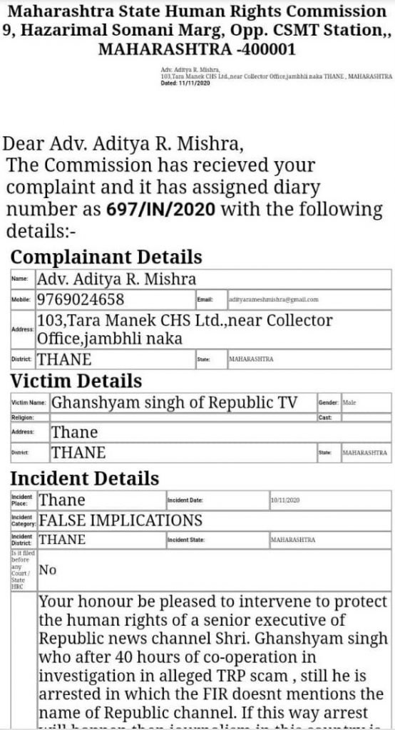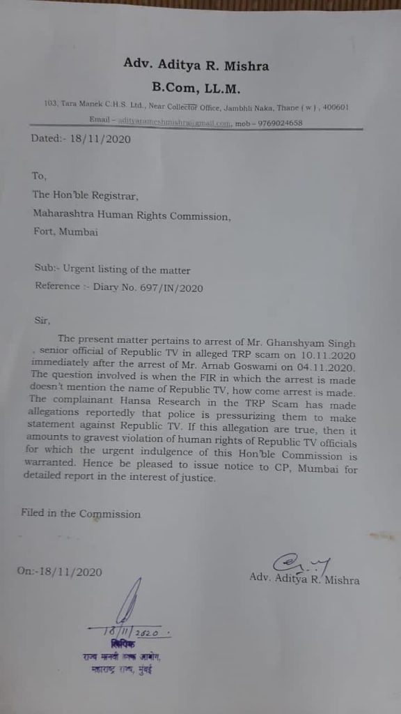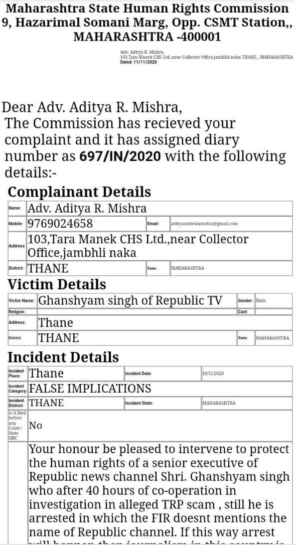 In a complaint filed to the Maharashtra Human Rights Commission, Advocate Aditya Mishra mentioned that the present matter pertains to arrest of Ghanshyam Singh of Republic TV in alleged TRP scam on November 10.