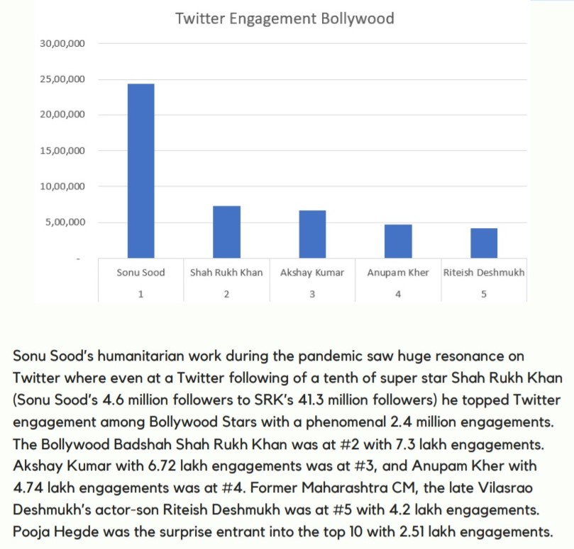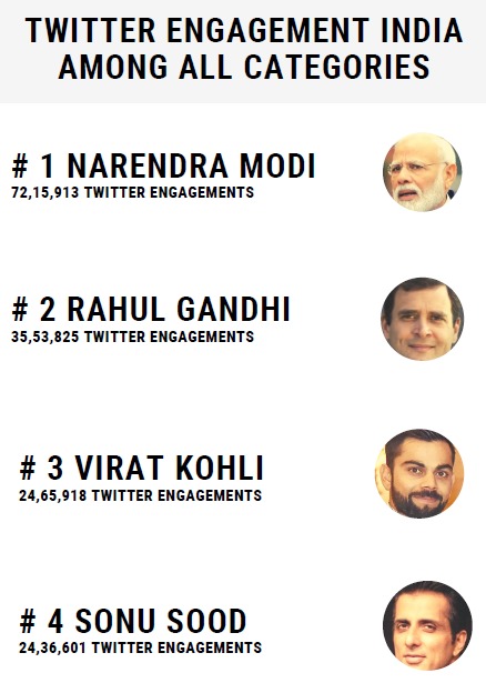 This was, of course, not a surprise as the popularity of Prime Minister Modi is unmatched not only on social media but offline as well. The real surprise, however, was Sonu Sood gained more Twitter engagements than any other entertainer. Sonu Sood garnered more than triple the number of engagements than Shah Rukh Khan, who came second.