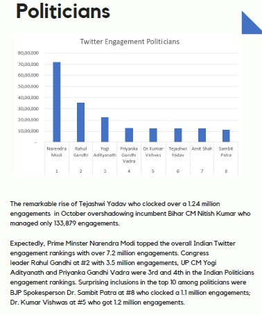 As for journalists, Deepak Chaurasia topped the chart in terms of Twitter engagement while Rohit Sardana came second. Swati Goel Sharma of Swarajya Mag broke into the top 5 at 5th while Rana Ayyub was at 6th and Rajdeep Sardesai at 8th for the month of October.