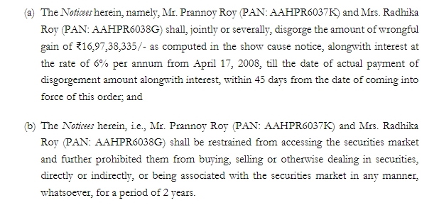 In the third order issued by SEBI, NDTV advisor Sanjay Dutt, his wife Prenita Dutt, and three entities linked to him have also been found guilty. The three firms are, Quantum Securities Private Limited, SAL Real Estate Private Limited and Taj Capital Partners Private Limited. Both the Dutts and the three companies have NDTV shares, and they also had traded in the shares during the restricted period. They also have been ordered to disgorge the illegal gain amount totally ₹2.2 crore, and they have been barred from the capital markets for 2 years.