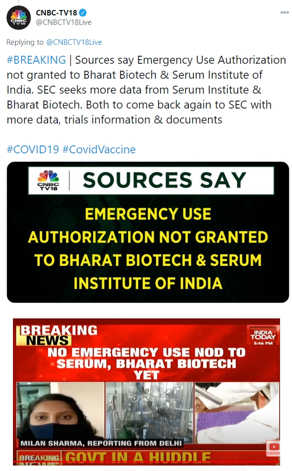 Although the government responded to the NDTV report, it was also carried by several other media houses. News18, India Today, CNBC TV 18 and several other media houses had carried similar news reports claiming that emergency use authorization has not been granted to Covid-19 vaccines of Serum Institute of India and Bharat Biotech over lack of data. All the media reports credited ‘sources’ for their reports.