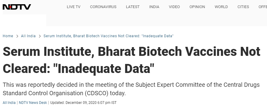 A report published by NDTV had claimed that Serum institute and Bharat Biotech’s proposals for emergency use of their Coronavirus vaccines use were not cleared over inadequate safety and efficacy data. The report quoted ‘sources’ claiming that “Both proposals are not approved due to inadequate safety and efficacy data available currently. Both have been asked for more data.”