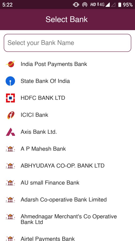 In the next step, the app will ask you to add your bank from the list of banks. It is a comprehensive list of banks and almost all the banks that offer UPI services are listed in the app. You can either scroll down to find your bank or you can write your bank’s name in the text area ‘Select your Bank Name’.