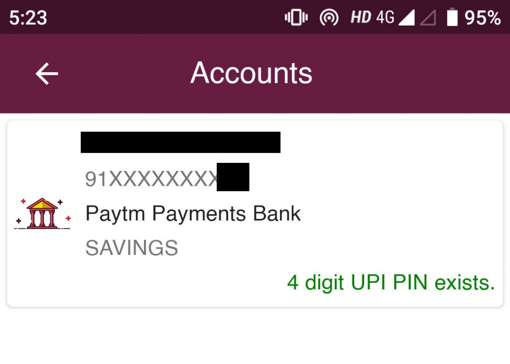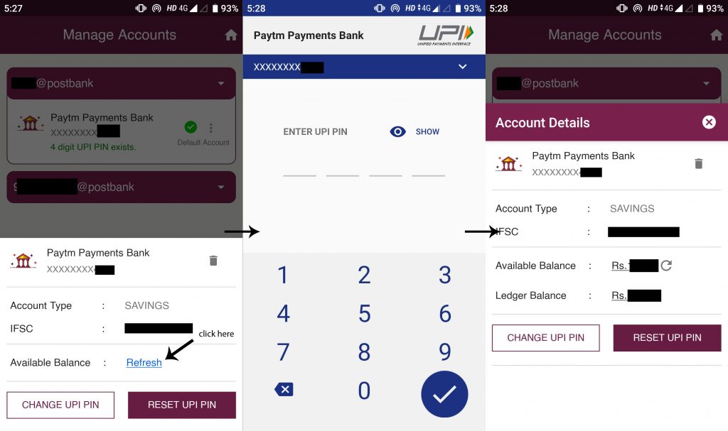 In case you want to check the balance in your bank account, click on the ‘Refresh’ next to ‘Available Balance’ and enter your UPI PIN. It will show you the balance in your linked bank account.