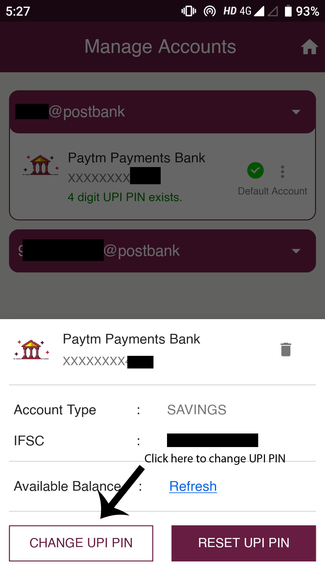 Once linked, it will show you both the newly created and the allotted UPI ID in the list. You can also use the app to change the UPI pin. Click on the three dots on the UPI ID and then click on Change UPI PIN.