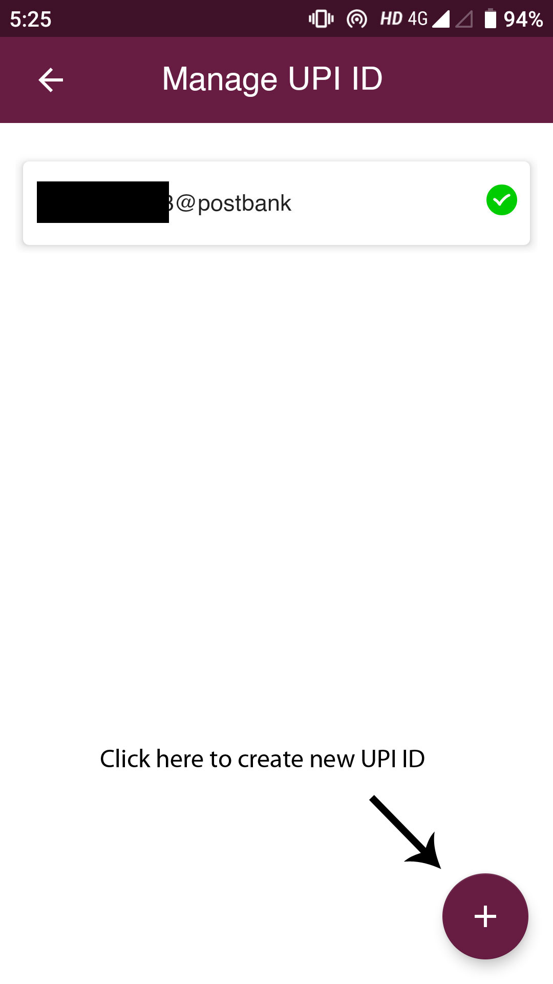 After linking your account to the app, it will show you the newly created UPI ID. In case you want to add a new ID, you can click on the ‘+’ icon at the bottom right corner of the app.