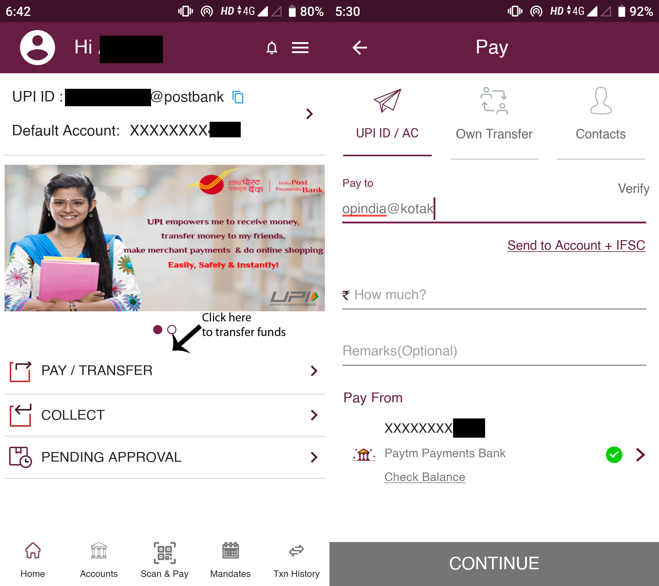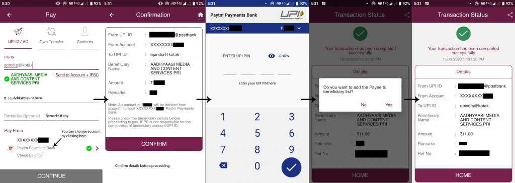 Add UPI ID and click on Verify. The name of the receiver will appear under the UPI ID. Add amount and remarks (if any). If you have added more than one bank accounts, you can choose the one you want to use by clicking on the arrow on the right bottom. Click on Continue. It will show you the details of the funds to be transferred, the account you are using, and amount etc., on the next screen. Now click Confirm. Enter your UPI ID and click on the ‘Tick mark’ on the right bottom. It will show you the transaction details and ask if you want to add the payee to your beneficiary list. If you add them, it will be easier to send them funds in future.