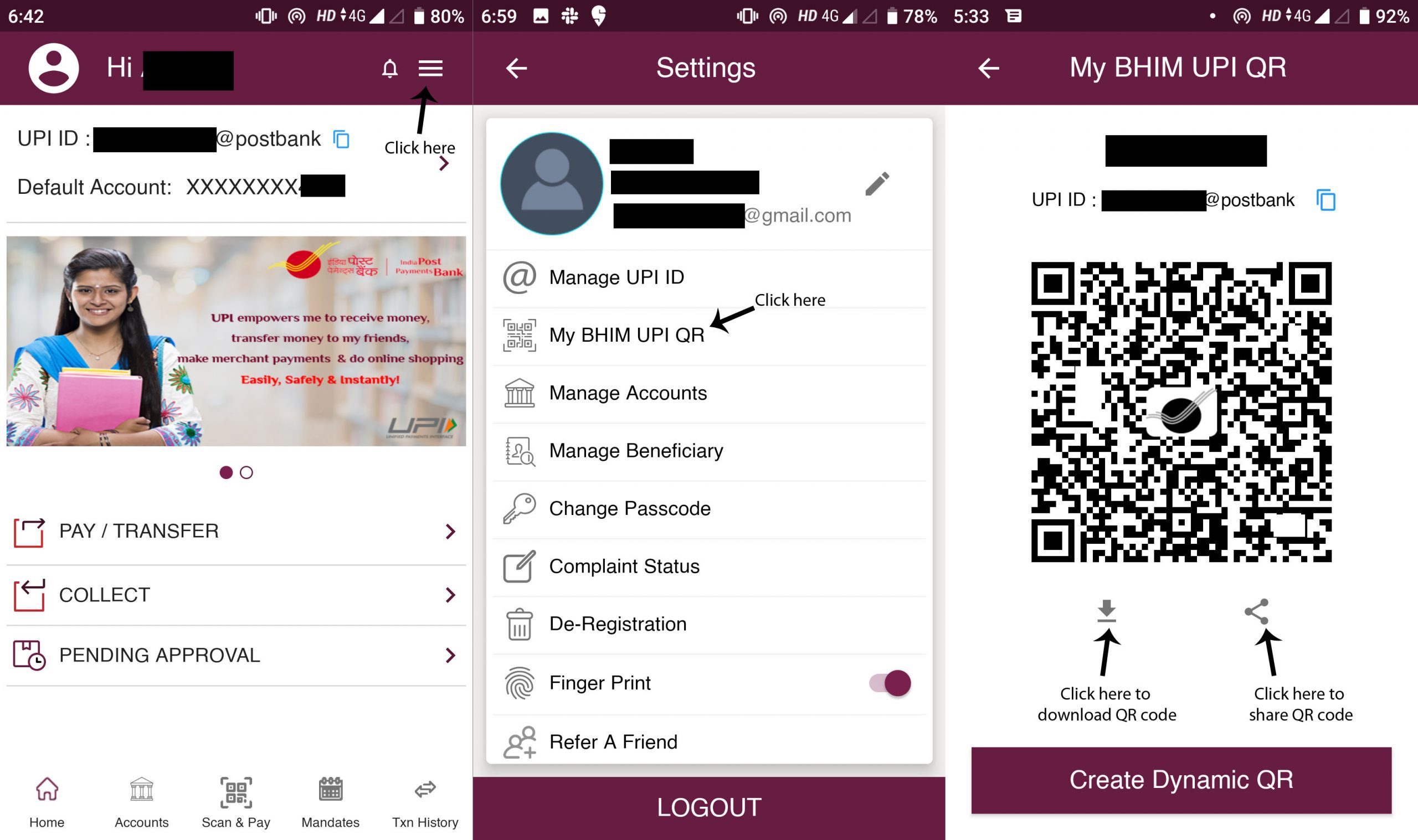 If you want to receive payments from someone, you can use your QR code for that purpose. To generate your QR code, click on the Burger Menu icon on the screen’s top right corner. Then click on ‘My Bhim UPI QR.’ It will show your QR code that you can download by clicking on the down arrow sign under the QR code or share it directly using the share icon next to it.