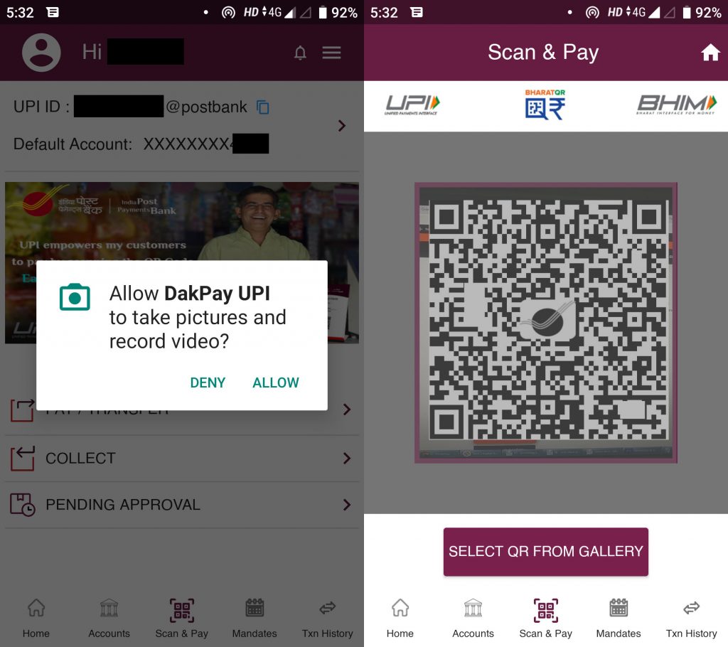 Click on the ‘Scan and Pay’ at the centre bottom. It will ask you to permit taking pictures and recording videos if you are doing it for the first time. The scanner will appear from where you can scan the QR code. You can also use the images from your gallery.