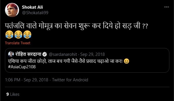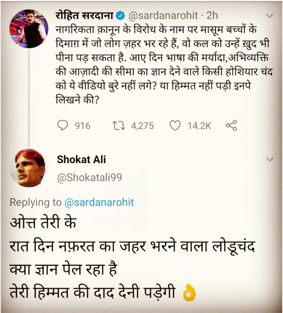 Since then, Shokat Ali has made several derogatory tweets against Rohit Sardana on the social media platform. In his derogatory tweets, he has also used the Hinduphobic ‘gaumutra’ slur, the same that was used by the Pulwama terrorist.