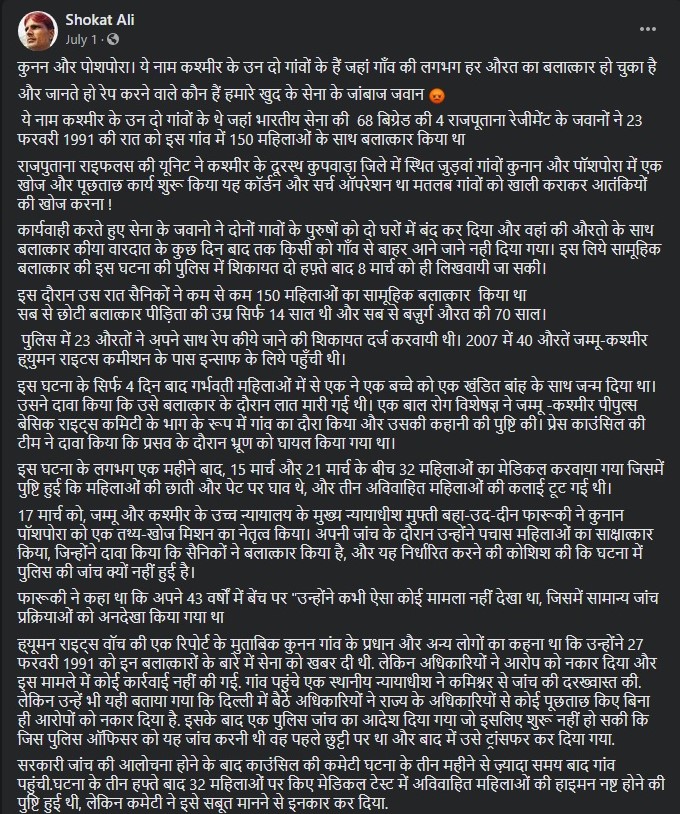 Shokat Ali in a post claimed that Indian soldiers rape Kashmiri women