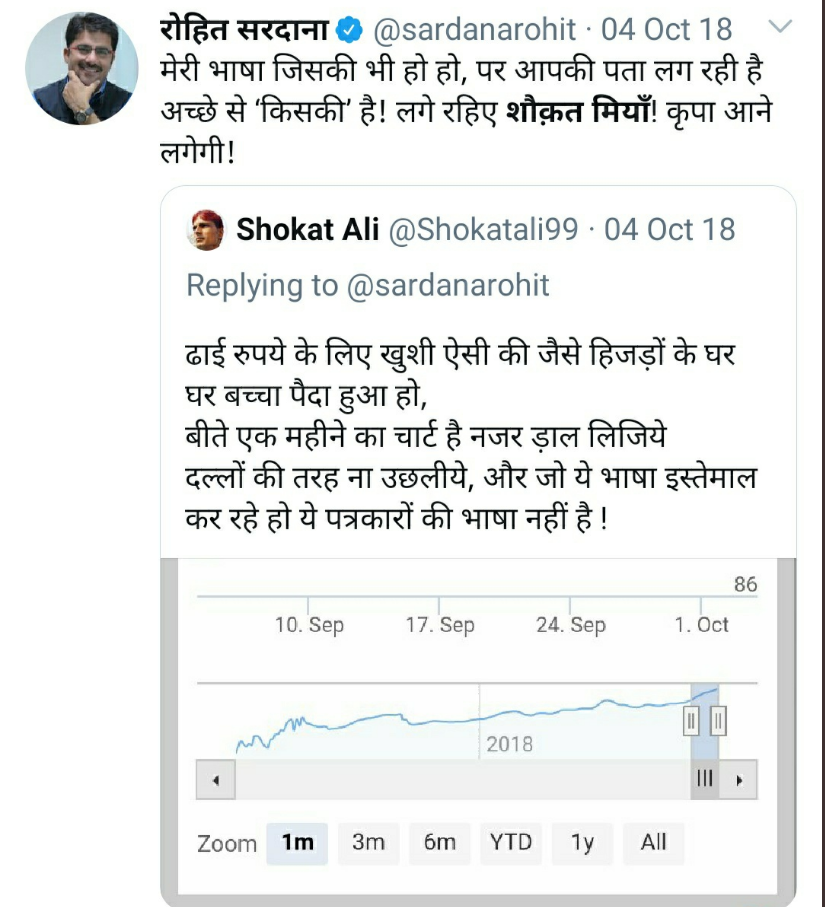 We cannot be sure whether Rohit Sardana was aware or not but this was not the first time he was responding to Shokat Ali. In fact, he had responded to a particularly vile abusive tweet from the same troll in October 2018.