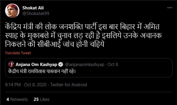Following the death of LJP patriarch ahead of the Bihar elections, the troll said that his death should be investigated as it occurred after the LJP split with the NDA. He was peddling the disgusting conspiracy theory when absolutely no one has questioned the circumstances of Ram Vilas Paswan’s death. Again, he was quoting a tweet by Anjana Om Kashyap.