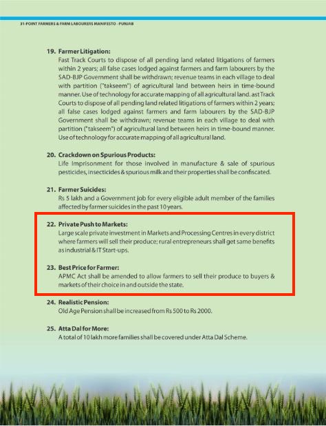 In order to seek votes, AAP conveniently promised reforms in the agriculture sector if it were voted to power in the elections. But when they were actually implemented, albeit, by a rival political party, it took a massive u-turn, criticising the Central Government for legislating the very same reforms which it had once promised in their manifesto. Here is the copy of the party’s 2017 Punjab manifesto which is accessible online [PDF].