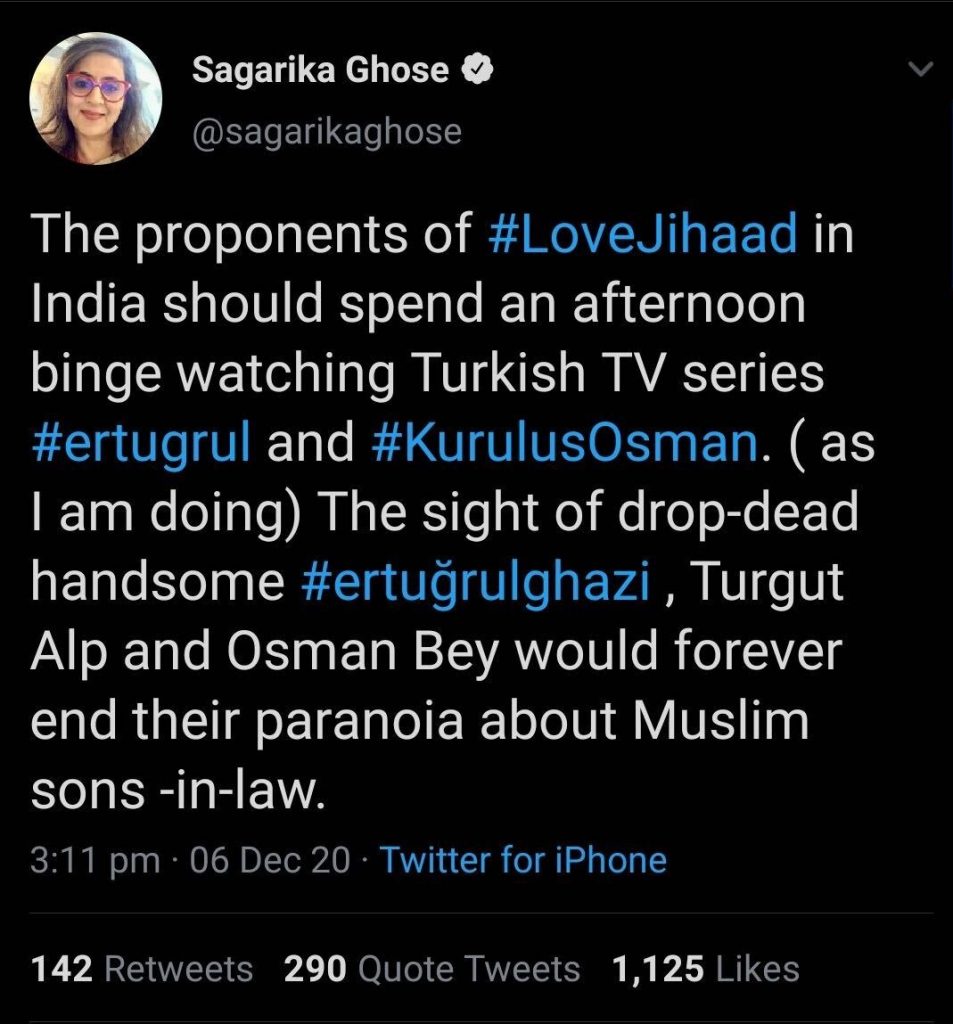 ‘Eminent journalist’ Sagarika Ghose provided a novel way of dealing with the menace of Grooming Jihad on Monday. According to her, the epidemic of Muslim men posing as Hindu to lure Hindu women into marriage and other sex crimes perpetrated against women of different faith by Muslim men with religious motivations can be solved by watching the Turkish TV series Ertugrul.