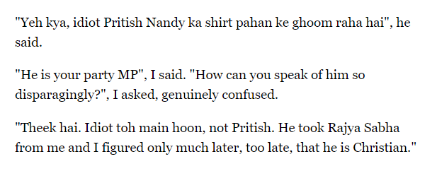 In his unique, no-holds-barred style, Balasaheb Thackeray replied, “Theek hai. Idiot toh main hoon,not Pritish (This is true. Actually, I am the idiot, not Pritish).” The Shiv Sena supremo emphasised, “He took Rajya Sabha from me and I figured only much later, too late, that he is Christian.” Remembering the conversation, Shekhar Gupta wrote, “Yet, it seems, at least once, he claims to have been foxed and that too by a poet journalist.”