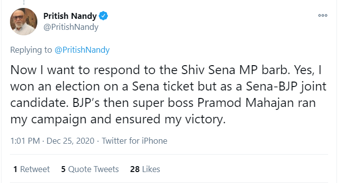 Pritish Nandy claimed that he was a joint candidate of the Sena-BJP alliance and that his candidature was supported and endorsed by BJP stalwart Pramod Mahajan. “Now I want to respond to the Shiv Sena MP barb. Yes, I won an election on a Sena ticket but as a Sena-BJP joint candidate. BJP’s then super boss Pramod Mahajan ran my campaign and ensured my victory,” the filmmaker tweeted.