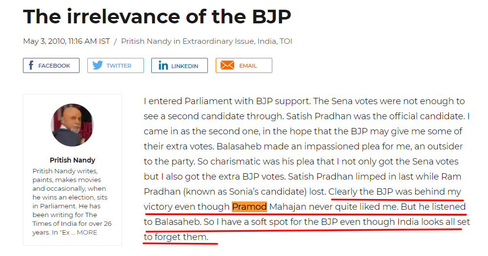 “Clearly, the BJP was behind my victory even though Pramod Mahajan never quite liked me. But he listened to Balasaheb,” he noted. Today, Pritish Nandy suggests that it was the BJP which proved to be game-changer for by emphasising that Pramod Mahajan had campaigned for him.