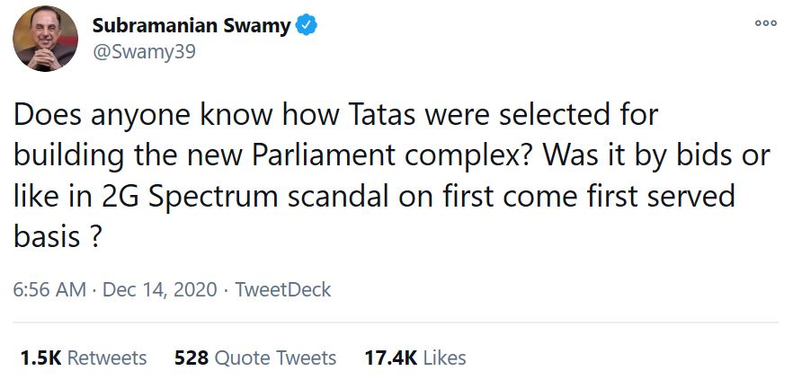 “Does anyone know how Tatas were selected for building the new Parliament complex? Was it by bids or like in 2G Spectrum scandal on first come first served basis?”, Tweeted Subramanian Swamy, wondering whether the Tata Projects limited won the contract through a fair bid or the contract was a scam, perhaps like the 2G spectrum scam under the UPA coalition government.