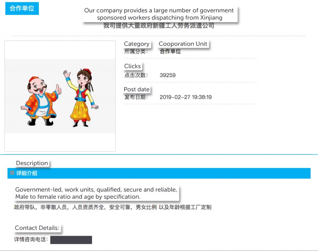 Another advertisement read, “The advantages of Xinjiang workers are: semi-military style management, can withstand hardship, no loss of personnel … Minimum order 100 workers!’. The advertisement also said that factory managers can apply for current Xinjiang police to be stationed at their factory 24 hours a day, and that the workers could be delivered (along with an Uyghur cook) within 15 days of the signing of a one-year contract.” This particular ad suggested that the workers are young and efficient and can work for a long duration every day in the factories.