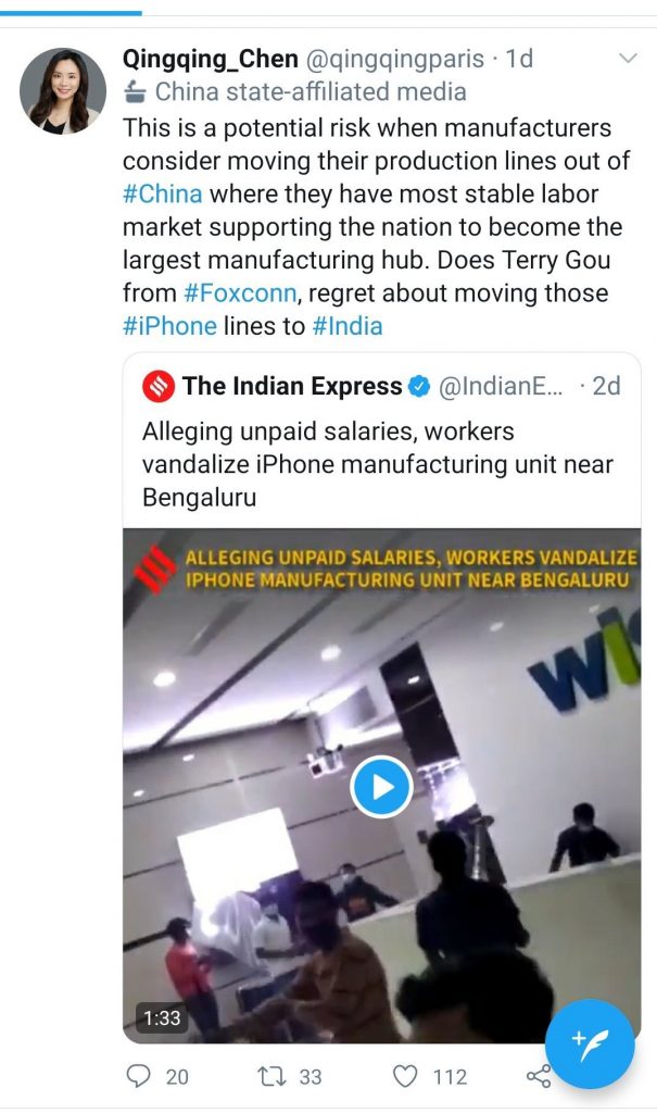 The propagandist of China’s Communist Party, subtly threatening the other partners of Apple Inc such as Foxconn, asked whether these companies now regret about moving their production facilities to India. Chen basically hinted that companies that move their production lines out if China may face such vandalism and loss to business. Chen’s tweet hinted at China’s role in causing such deliberate disturbances inside India to disturb the prevailing stability and investment climate in the country.