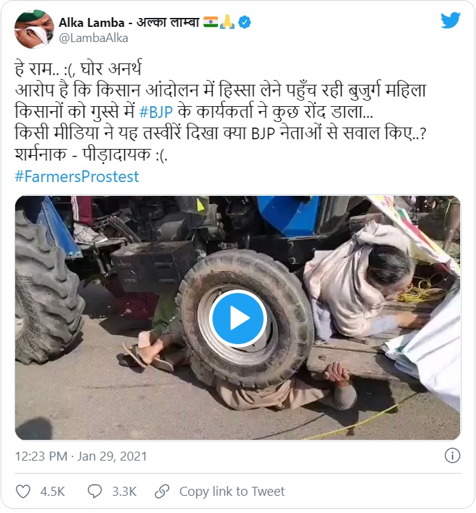 Taking to Twitter, the Congress leader Alka Lamba claimed that a BJP activist had run over his tractor the elderly women who were reaching to participate in the farmers’ rally. Calling it a gross misery, Alka Lamba put out misinformation accusing BJP of killing protestors and asked the media whether they would pose questions to the BJP leaders.