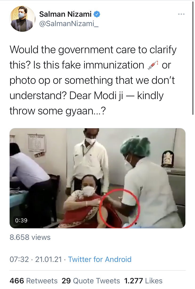 “RSS & BJP ruled Karnataka… Kar Natak RSSwale”, the Congress leader further alleged that it was being done on the behest of the BJP and the RSS. The video was originally shared by an ‘independent’ journalist named Sonia Arunkumar. Several other users on social media also claimed that the two medical officers seen in the video were ‘faking’ vaccination for the camera.