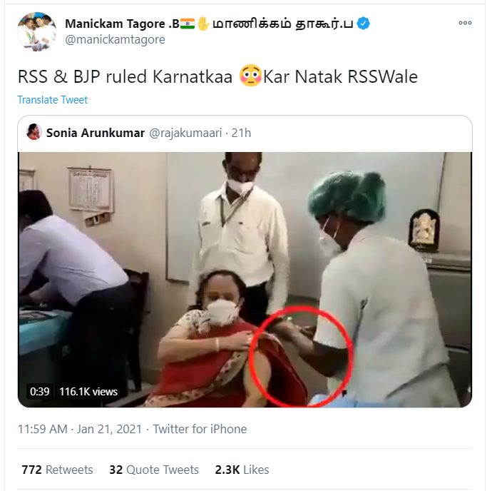 On Thursday, Congress MP Manickam Tagore had decided to peddle fake news to defame the BJP and the Rashtriya Swayamsevak Sangh (RSS) at the expense of Coronavirus frontline workers. He had retweeted a video of two medical officers being vaccinated in Tumakuru in Karnataka and insinuated that they were doing a photo op for the camera.