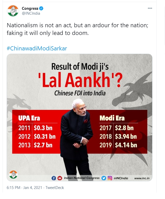 In yet another incident of the Congress party spreading fake news to target the Modi government, the party has made a false claim regarding FDI into the country from China. On 4th January, the official Twitter handle of the Congress party posted an ‘infographic’, which claimed that under the Modi government, Chinese FDI into India has been increasing.